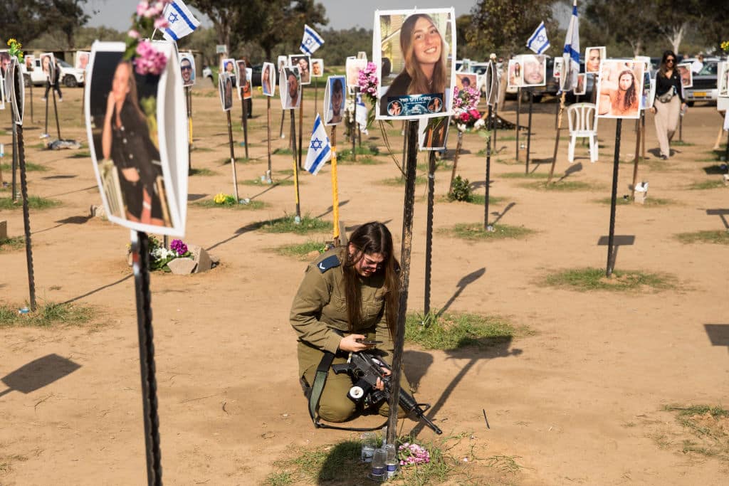 Photo: An Israeli soldier mourns near a photo of a relative killed at the Nova music festival site during the 7 October 2023 Hamas attack, Re'im, Israel, 5 January 2024. Approximately 40 hostages were taken from the Nova music festival site during Hamas' attack, while 364 were killed, according to Israeli authorities. (Photo by Amir Levy/Getty Images.)