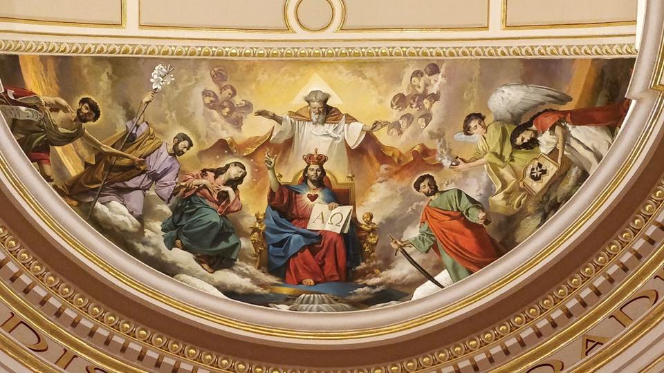 The fresco depicts Christ the King, to which the church is dedicated, along with Saint John the Baptist, Saint Joseph, Our Lady Immaculate, an angel offering incense and an allegorical figure representing Malta herself, holding the emblem of the Eucharistic Congress, which was held in 1913, the year the Church was built, as a celebration of that event.