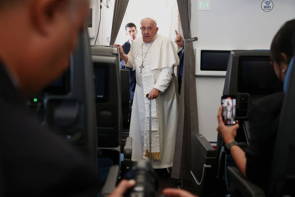 <a href="RELATED: Pope’s voyage between third and first worlds is a microcosm of his papacy and 11-year message"><mark style="background-color:rgba(0, 0, 0, 0)" class="has-inline-color has-vivid-cyan-blue-color"><strong><em>RELATED: Pope’s voyage between third and first worlds is a microcosm of his papacy and 11-year message</em></strong></mark></a><br><em><br>Photo: Pope Francis attends a news conference aboard the papal plane on his flight back after his 12-day journey across Southeast Asia and Oceania, 13 September 2024. (Photo by GUGLIELMO MANGIAPANE/POOL/AFP via Getty Images.)</em>