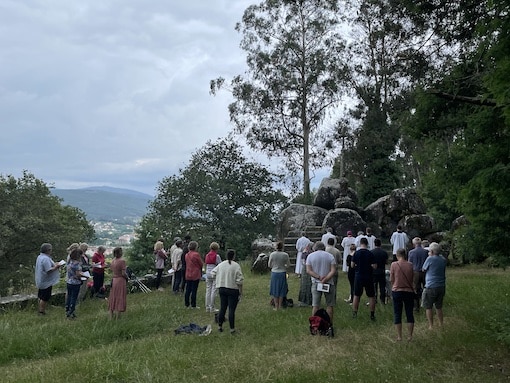 During the seminarians’ Camino, Masses were usually said in the middle of the day, beside the Camino trail, after we had broken march, so to speak. Stoles, alter linen and everything needed for communion emerged out of rucksacks and a makeshift altar was established with the best surface was available. When Fr Neil Scott, whose ministry is in prisons, said Mass in a forest clearing utilising some granite picnic tables, his words were accompanied by a Galician bagpipe being played full blast by a lady on the other side of the clearing busking for tips from passing pilgrims.