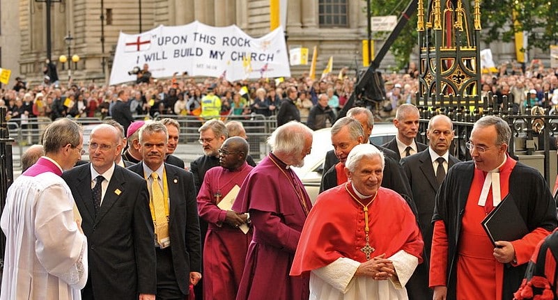 We, our friends and parishioners did make a banner, a 6-metre-long banner, and the cameras did not miss it. Cardinal Nichols did not miss it. And neither did Pope Benedict XVI when he passed us in his Popemobile on Lambeth Bridge. We then walked with the banner, singing the Salve Regina at the tops of our voices, all the way to Westminster Abbey. Our timing was providential: “Upon this Rock I will build My Church” – as the banner pointed out – provided the backdrop for photographs published across the world the Pope arrived at and entered the place where the Supreme Governor of the Church of England is crowned.