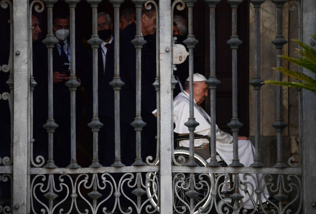 Image caption: Pope Francis, seated in a wheelchair following knee treatment, leaves after presiding over the Rosary for peace in Ukraine and end to wars worldwide, on May 31, 2022 at the Basilica of St. Mary Major in Rome. (Photo by FILIPPO MONTEFORTE/AFP via Getty Images)