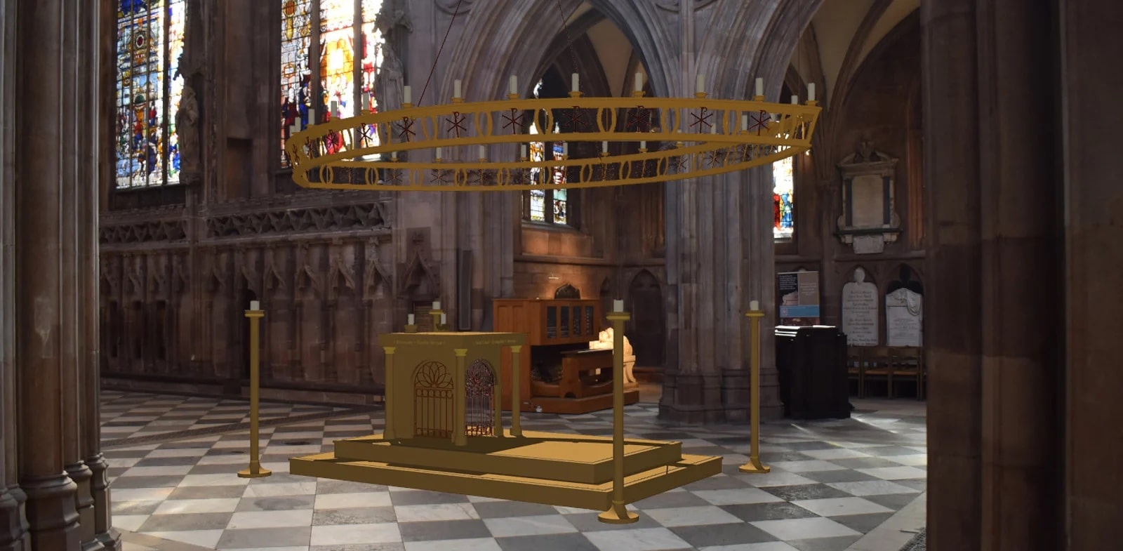 The new Shrine of St Chad is situated at the front of the Lady Chapel and is illuminated by a golden corona of light suspended from the ceiling.