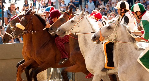 The Palio dates back to the medieval period and remains firmly bound up in arcane rituals and rules. Lots decide which riders will represent each of the fabulously named districts, such as She-Wolf, Valley of the Ram and Crested Porcupine. If a rider is unseated, his horse can still win the race, a convention that adheres to the Palio principle that jockeys are expendable mercenaries, in contrast to their unimpeachable equine counterparts.