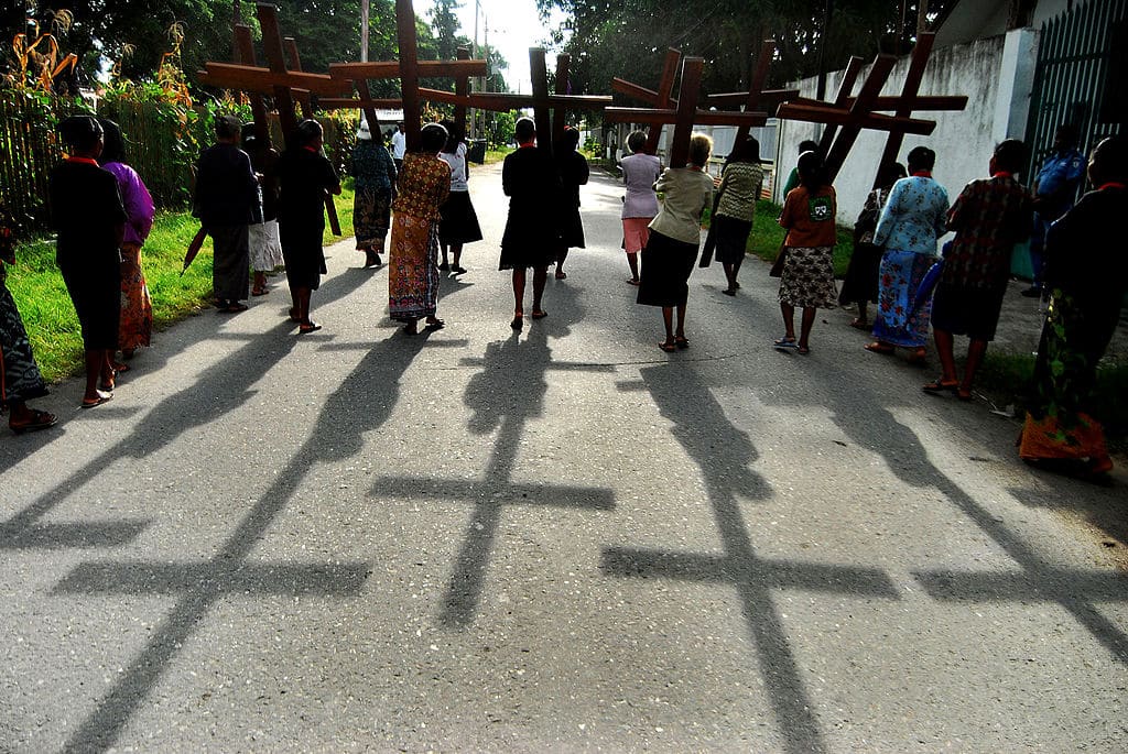 Photo: Roman Catholic devotees carry crucifixes along the main road of the East Timor capital Dili to mark Palm Sunday, 28 March 2010. (Photo credit MARIO JONNY DOS SANTOS/AFP via Getty Images.)