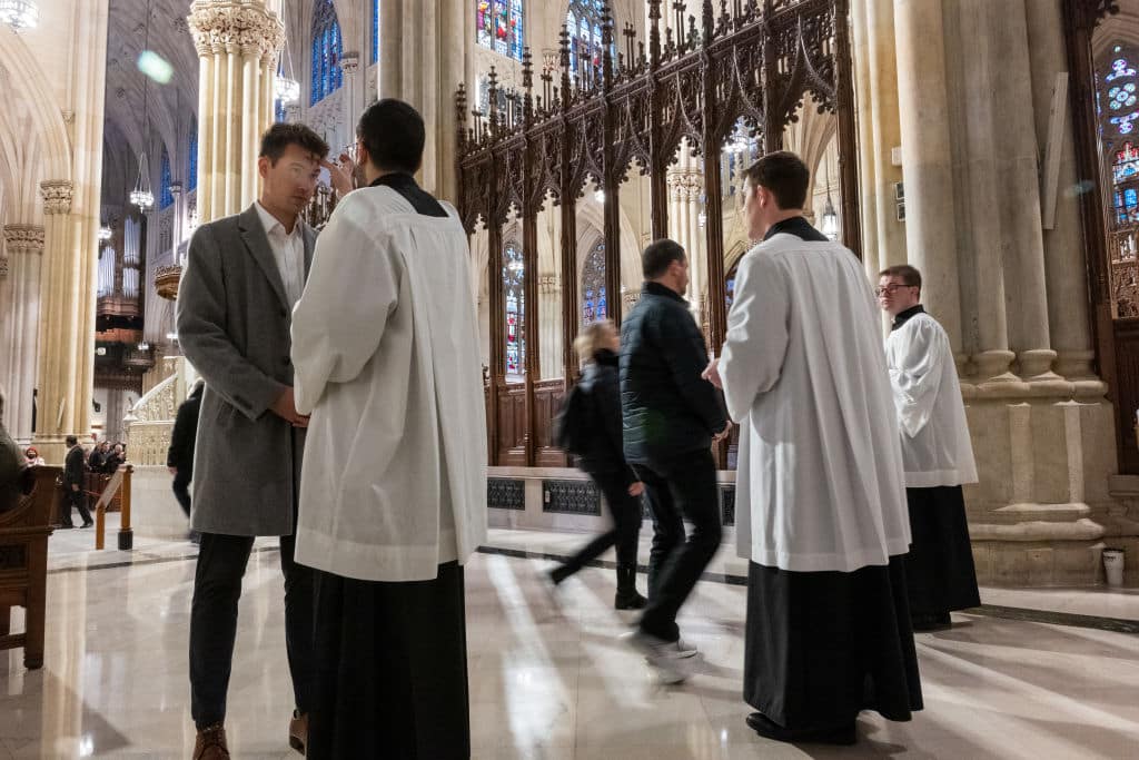 Photo: Young priests mark the sign of the cross on people's foreheads on Ash Wednesday in St. Patricks Cathedral, New York, 14 February 2024. (Photo by Spencer Platt/Getty Images.)