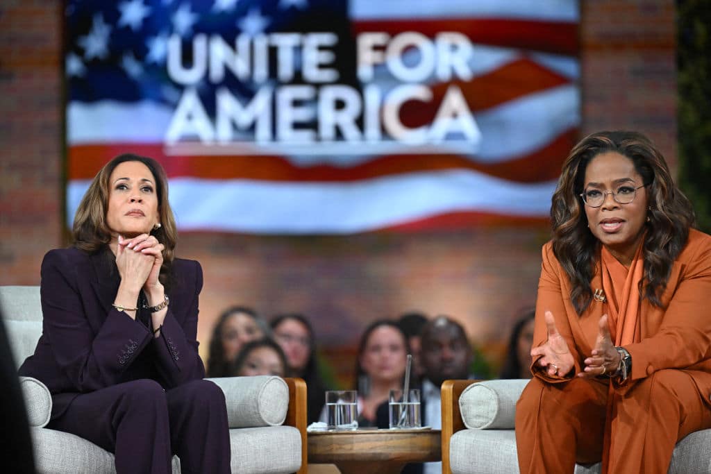 <em>Photo: US Vice President and Democratic presidential candidate Kamala Harris (left) joins Oprah Winfrey at a 'Unite for America' live streaming rally in Farmington Hills, Michigan, USA, 19 September 2024. (Photo by SAUL LOEB/AFP via Getty Images.)</em>
