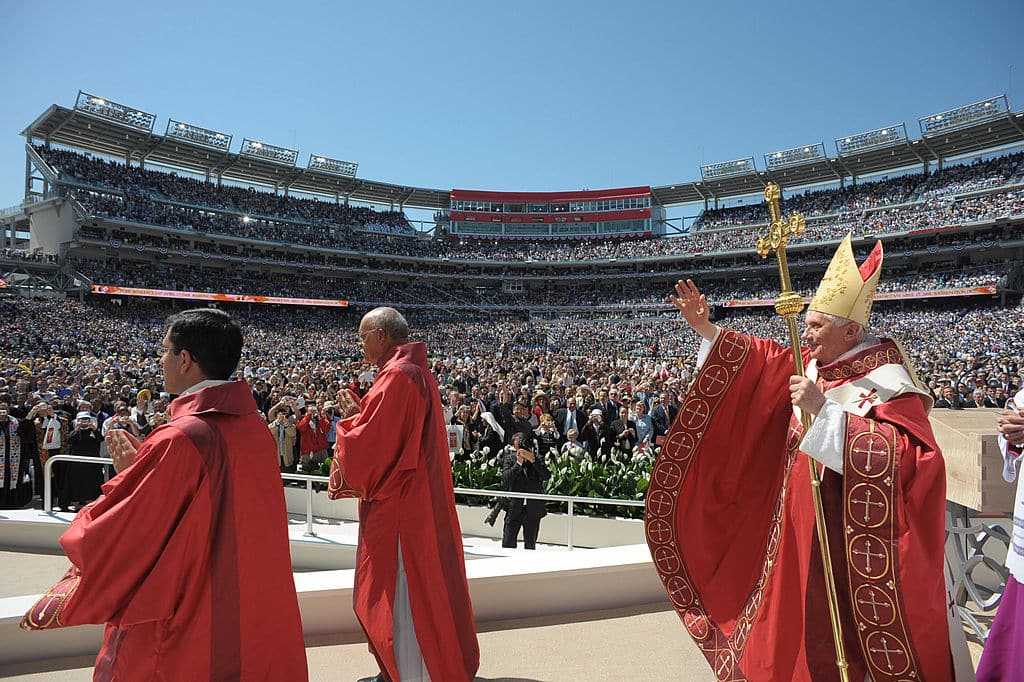 <em>Photo: Pope Benedict XVI greets the crowd at the Nationals Park stadium in Washington, DC, USA, 17 April 2008. The home stadium of the Washington Nationals baseball team became a 'church for a day' when Pope Benedict XVI celebrated the first of two huge open-air masses during his six-day visit to the United States. (Photo credit should read VINCENZO PINTO/AFP via Getty Images.)</em>