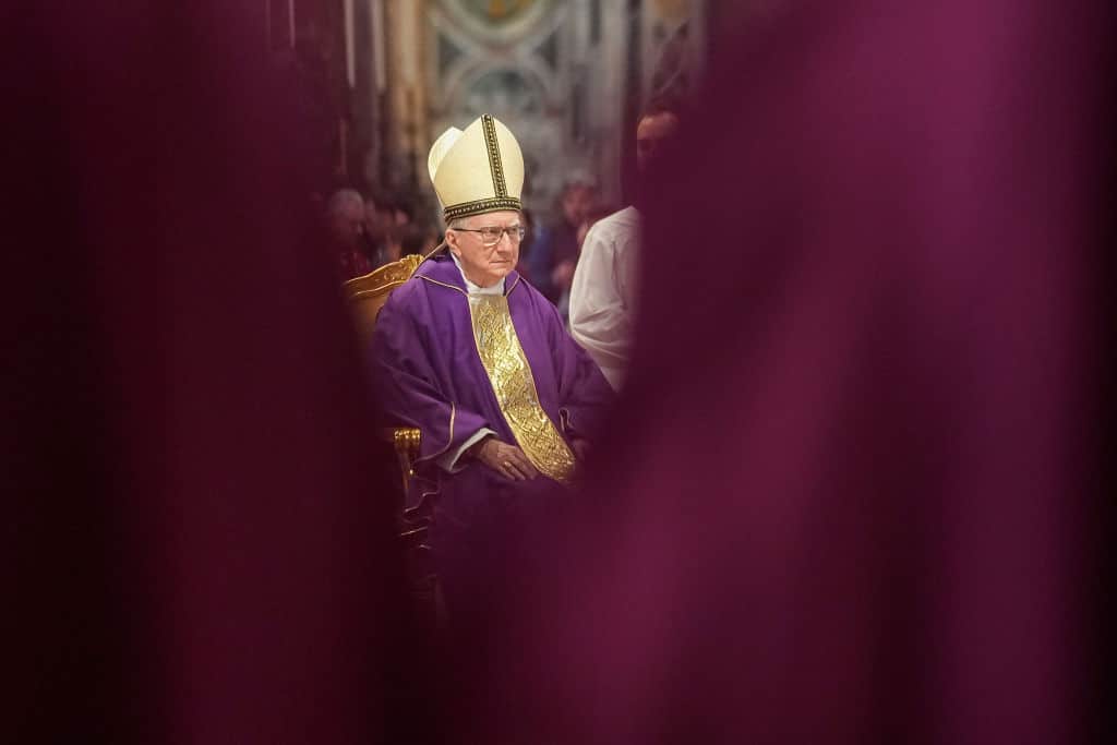 Photo: Cardinal Pietro Parolin conducts a Mass in St Peter's Basilica for The Movement for Life Association whilst Pope Francis remains in hospital, Vatican City, 8 March 2025. (Photo by Christopher Furlong/Getty Images.)