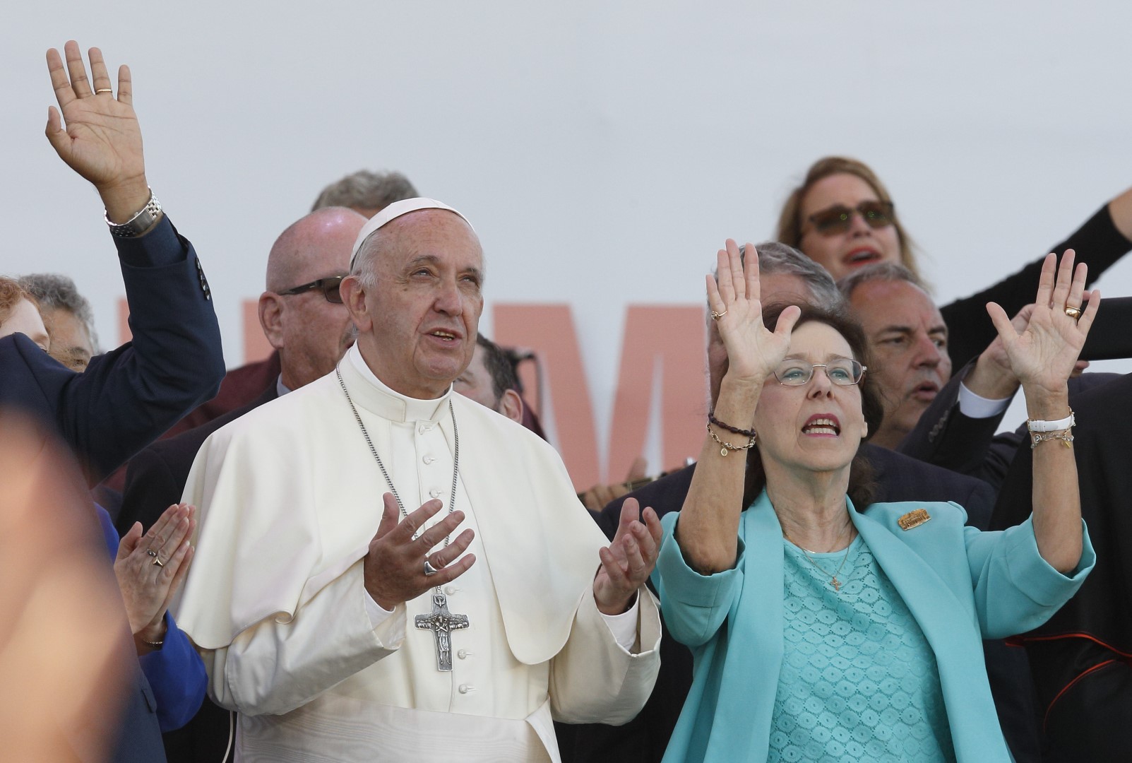 The Pope joined in the singing as he stood between Michelle Moran, president of the International Catholic Charismatic Renewal Services, and Patti Mansfield, who was present when the Catholic Charismatic Renewal was born.