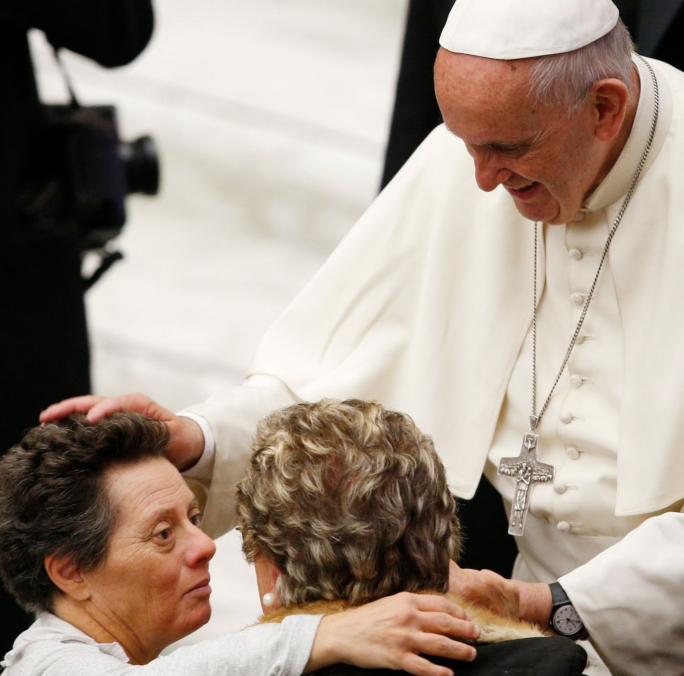 With fewer than 10,000 pilgrims present and with rain forecast, the Vatican moved the audience indoors to the Vatican audience hall.