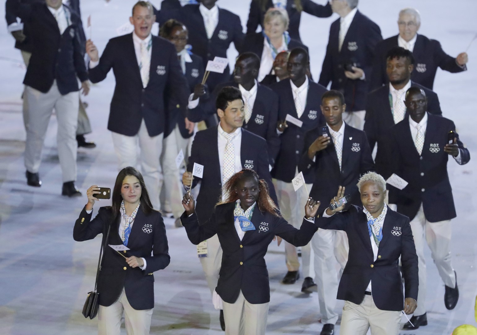 Five of the athletes -- including Rose Nathike Lokonyen, 23, the team's flag bearer for the opening ceremony -- are South Sudanese refugees who were living in the huge Kakuma refugee camp in Kenya.
