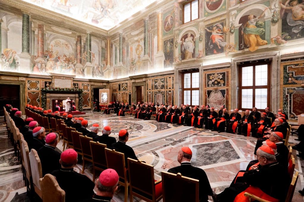 Photo: Cardinals listen to the Pope delivering a speech on the occasion of his Christmas greetings to the Roman Curia in the Clementine Hall at the Vatican, Italy, 21 December 2019. (Photo by ANDREW MEDICHINI/POOL/AFP via Getty Image.)
