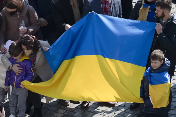 The 85-year-old pontiff spoke to the crowd gathered in St. Peter’s Square in Rome following the Angelus, a Marian prayer, on March 6. The faithful gathered to pray with the pontiff, including many from Ukraine, who held up the blue and yellow flag of their country in the bright sunshine for all to see.