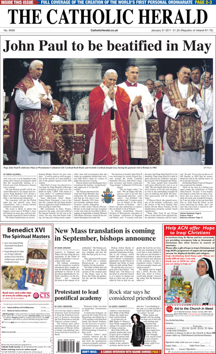 This week, one of the west's leading Muslim scholars, Abdal Hakim Murad, offers his perspective on violence against Christians in the Middle East; Léonie Caldecott recalls the happiest day of Pope John Paul II's life; pro-life MP Nadine Dorries says churches have been pathetic in the fight to reform abortion law; and Stuart Reid writes about the love that Dorothy Day gave up to follow Christ. Plus, we report on the disclosure by White Stripes singer Jack White that he once considered the priesthood.