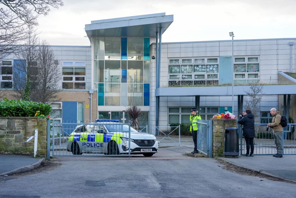 Photo: Police and crime scene investigators work at All Saints Catholic High School after the fatal stabbing of Harvey Willgoose, Sheffield, England, 4 February 2025. (Photo by Christopher Furlong/Getty Images.)