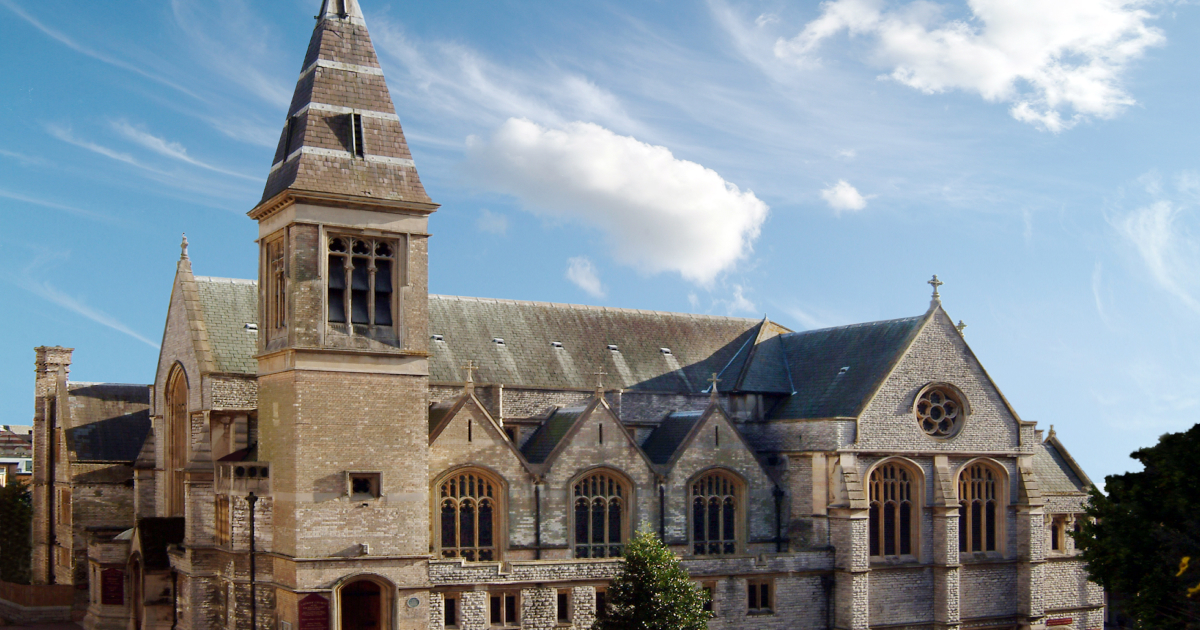 Holy Trinity Church, Dorchester was originally built in "Middle Pointed" Gothic style for the Church of England in 1875-6 by Benjamin Ferrey. It was declared redundant in 1974 and acquired for Catholic use in 1976 to replace the previous church of Our Lady Queen of Martyrs, higher up West Street, originally designed by Canon Scoles in 1889 in Wareham and re-erected in Dorchester in 1906-7. The fittings of Holy Trinity are an amalgam of Anglican and Catholic. The onyx marble altar came from the earlier Catholic church. The 1897 reredos is from Oberammergau and some of the stained glass is by Kempe.