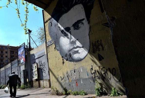(A graffiti by Italian artist Ozmo depicting Italian writer Antonio Gramsci covers a wall in Rome on March 31, 2014 | ALBERTO PIZZOLI/AFP via Getty Images)