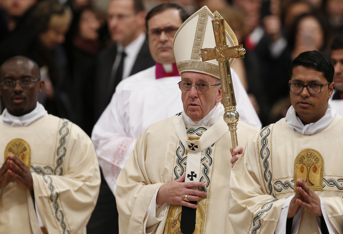 Thousands of people were gathered in St Peter's Basilica as the Pope entered to the sounds of the choir singing "Angels we have heard on high" in Latin. Before taking his place in front of the altar, the Pope stood in front of a statue of baby Jesus, spending several minutes in veneration before kissing it.