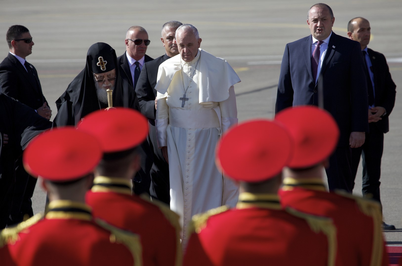 The formal meetings took place after a brief airport welcoming ceremony. The president and patriarch were at the airport to welcome the Pope. Pope Francis and Orthodox Patriarch Ilia II stood next to each other as the Vatican and Georgian national anthems were played.