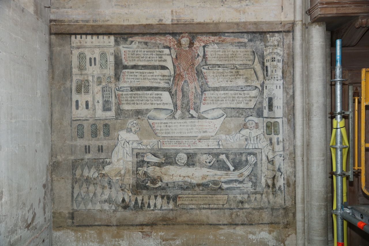 After John’s son William retired to Stratford, he lived opposite the Guild Chapel until his death in 1616. Four hundred years later, those covered murals are being revealed in their fullness. A major restoration project, titled Death Reawakened, finishes this month. The faith of Catholic England will be shown in the images which lived in our ancestors’ imaginations: depictions of the Last Judgment, the Crucifixion, the lives of St George and St Thomas Becket.