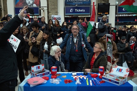 (Royal British Legion poppy sellers look on as they are surrounded by people staging a sit-in inside Charing Cross train station during a pro-Palestinian demonstration on November 4, 2023 in London, United Kingdom | Photo by Carl Court/Getty Images)