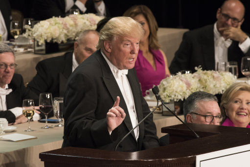 The speeches largely exhibited the gently mocking humour which is traditional at the event. Trump's biggest laughs came as he talked about claims Melania Trump had copied parts of a speech from Michelle Obama. "They think absolutely great. My wife Melania gives the exact same speech, and people get on her case," he said to whoops and laughs.