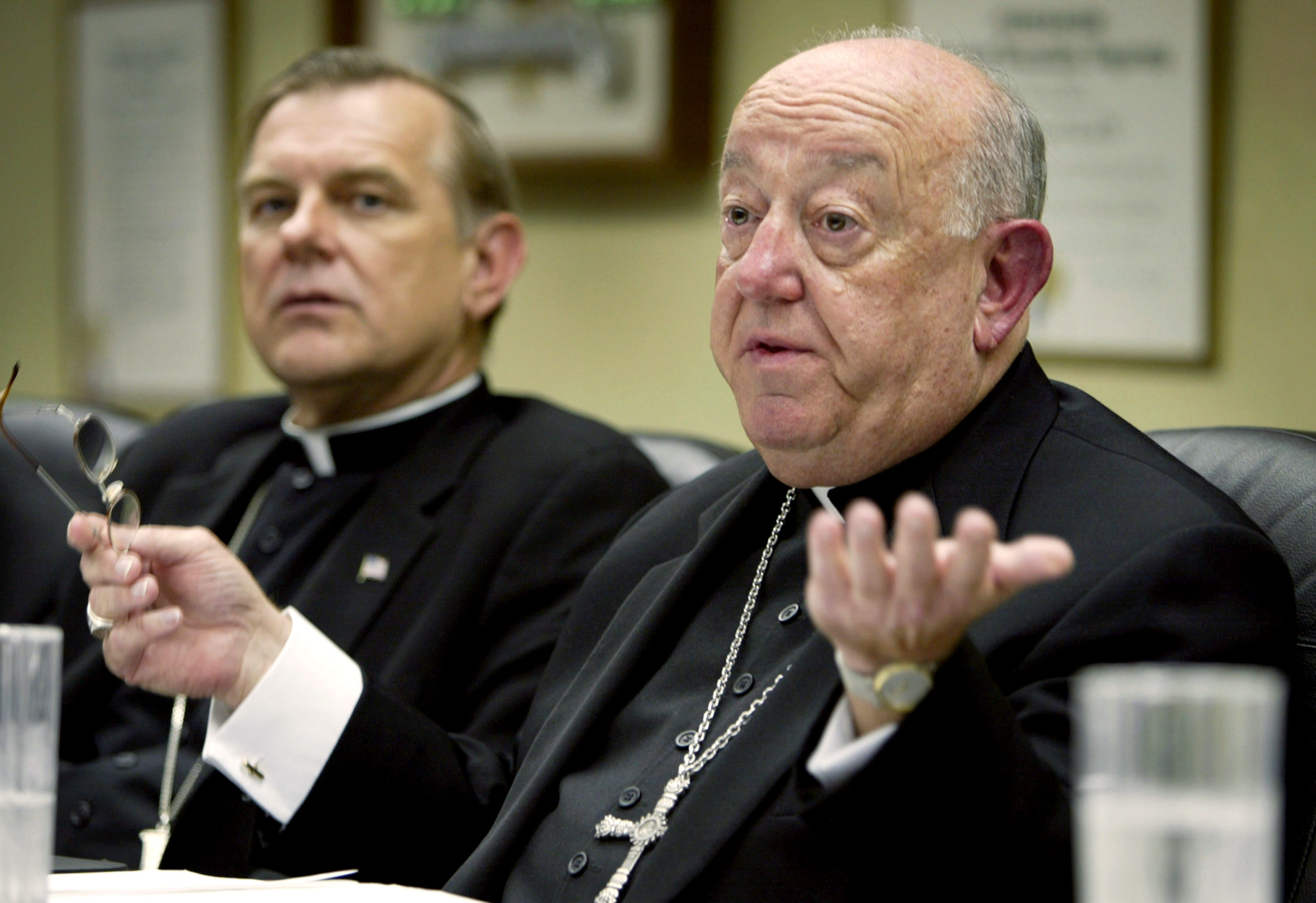 Miami Archbishop John C. Favalora and Bishop Thomas Wenski speak to the news media on 17 June 2002 in Miami, Florida. The US Conference of Bishops approved the Charter for the Protection of Children and Young People on 14 June 2002, banning priests who sexually abuse children from ministerial duties, regardless of when the abuse was committed.