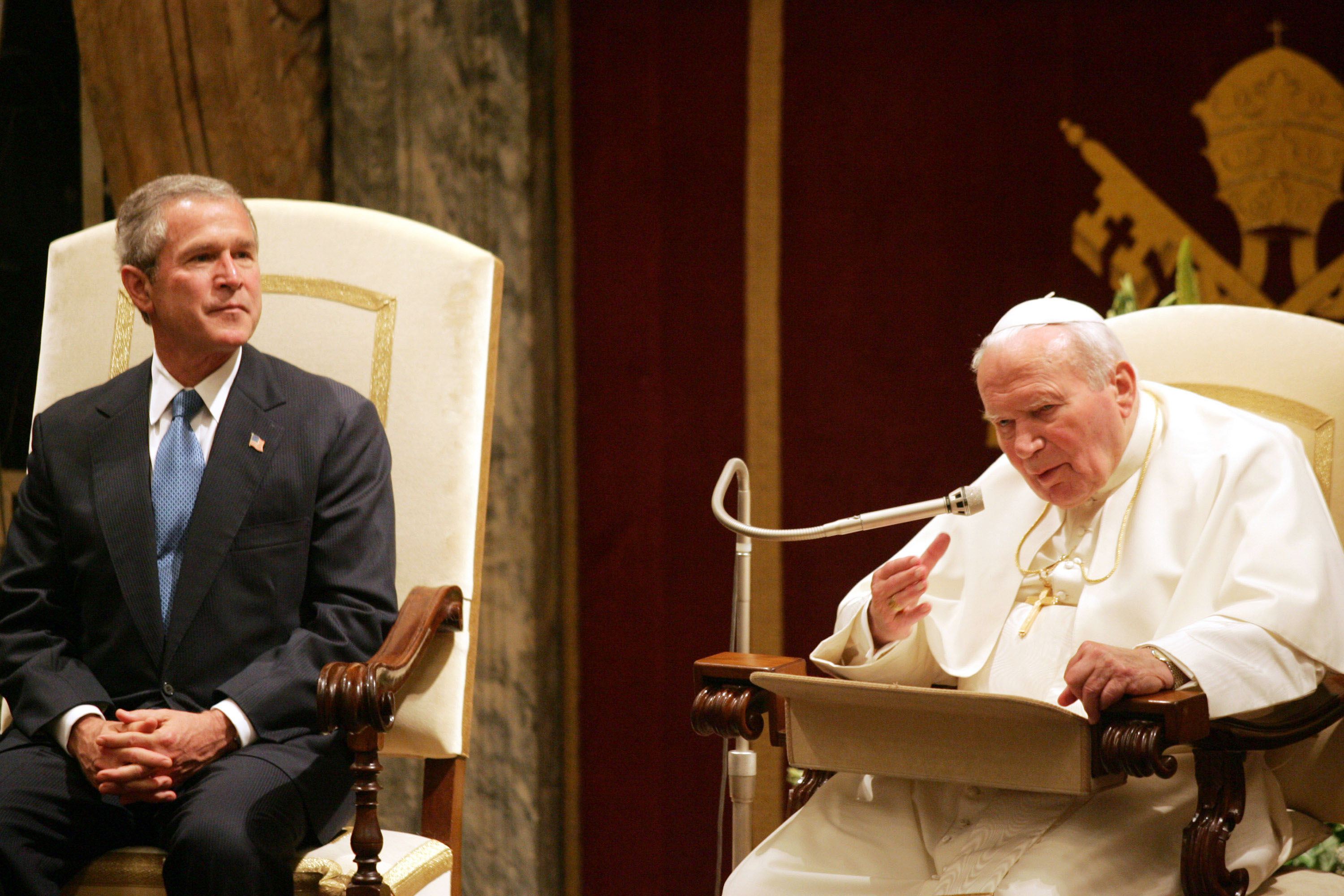 Pope Saint John Paul II and US President George W. Bush pose during their meeting on 4 June 2004 in Vatican City. Bush was on a two-day visit to Italy en route to commemorations marking the 60th anniversary of the D-Day landings in Normandy, France. The Iraq War, which John Paul II was vehemently opposed to, was the primary point of friction in discussions.