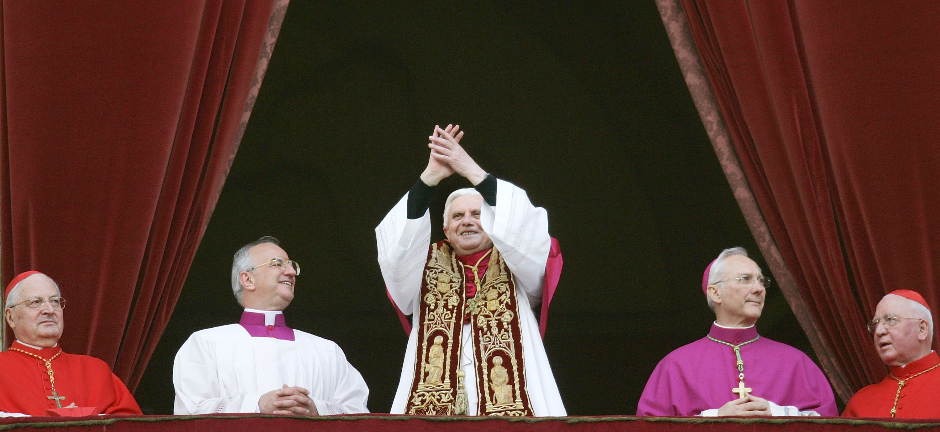 Pope Benedict XVI, Cardinal Joseph Ratzinger of Germany, waves from a balcony after being elected by the conclave of cardinals on 19 April 2005 in Vatican City. The 265th pope would lead the world’s one billion Catholics for eight years, succeeding Pope Saint John Paul II, who died on 2 April that year.