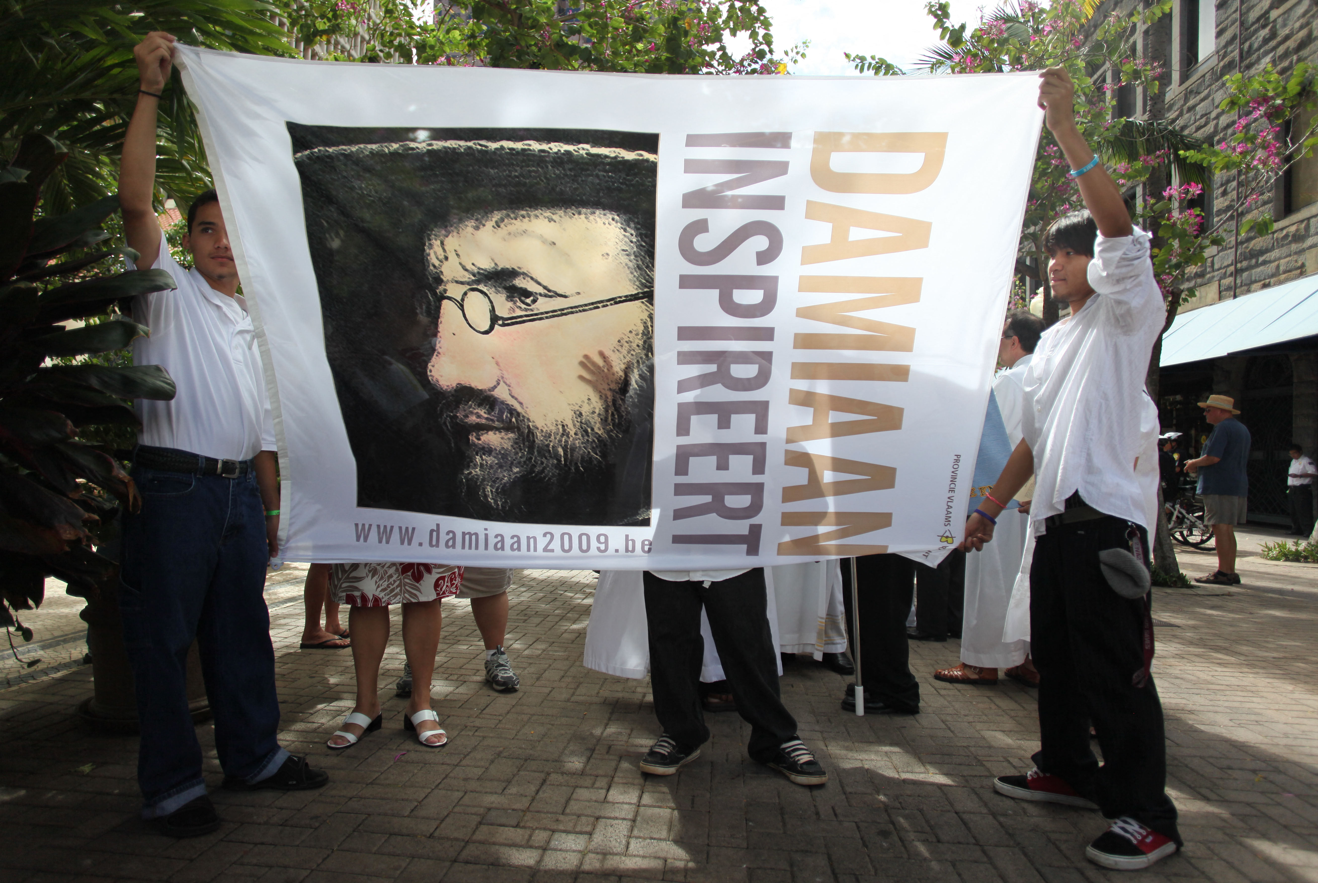 A sign written in Dutch is carried during a procession of Saint Damien of Molokai’s relics from the Cathedral of Our Lady of the Peace to Iolani Palace on 1 November 2009 in Honolulu, Hawaii. The state marked Damien’s canonisation with a Mass and an interfaith celebration highlighting the enduring popularity of the 19th-century priest. The commemorations followed his canonisation in Rome several weeks earlier by Pope Benedict XVI.