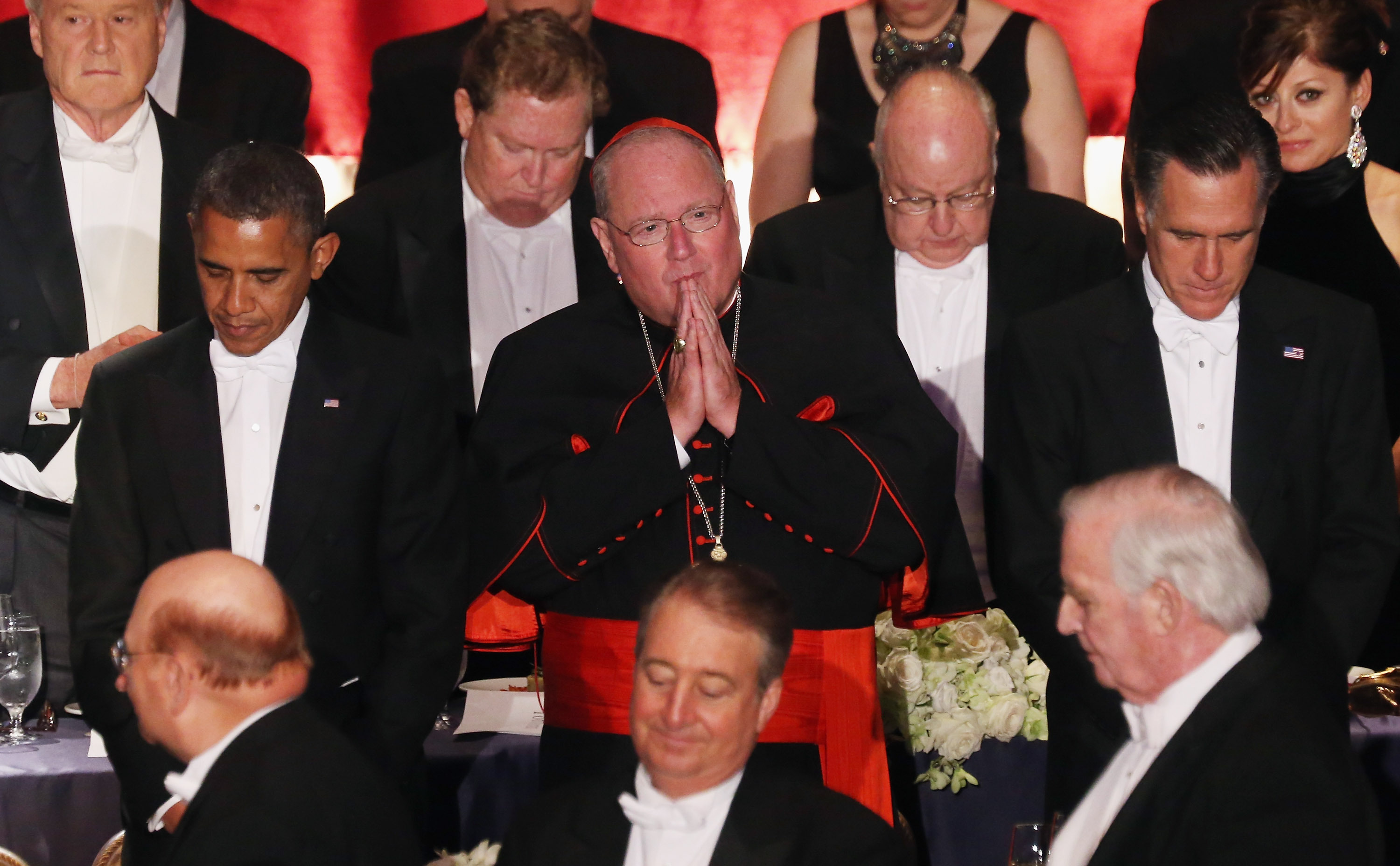 US President Barack Obama, Cardinal Timothy Dolan, Archbishop of New York, and Republican presidential candidate Mitt Romney pray at the start of the 67th Annual Alfred E. Smith Memorial Foundation Dinner at the Waldorf-Astoria Hotel in New York City on 18 October 2012.