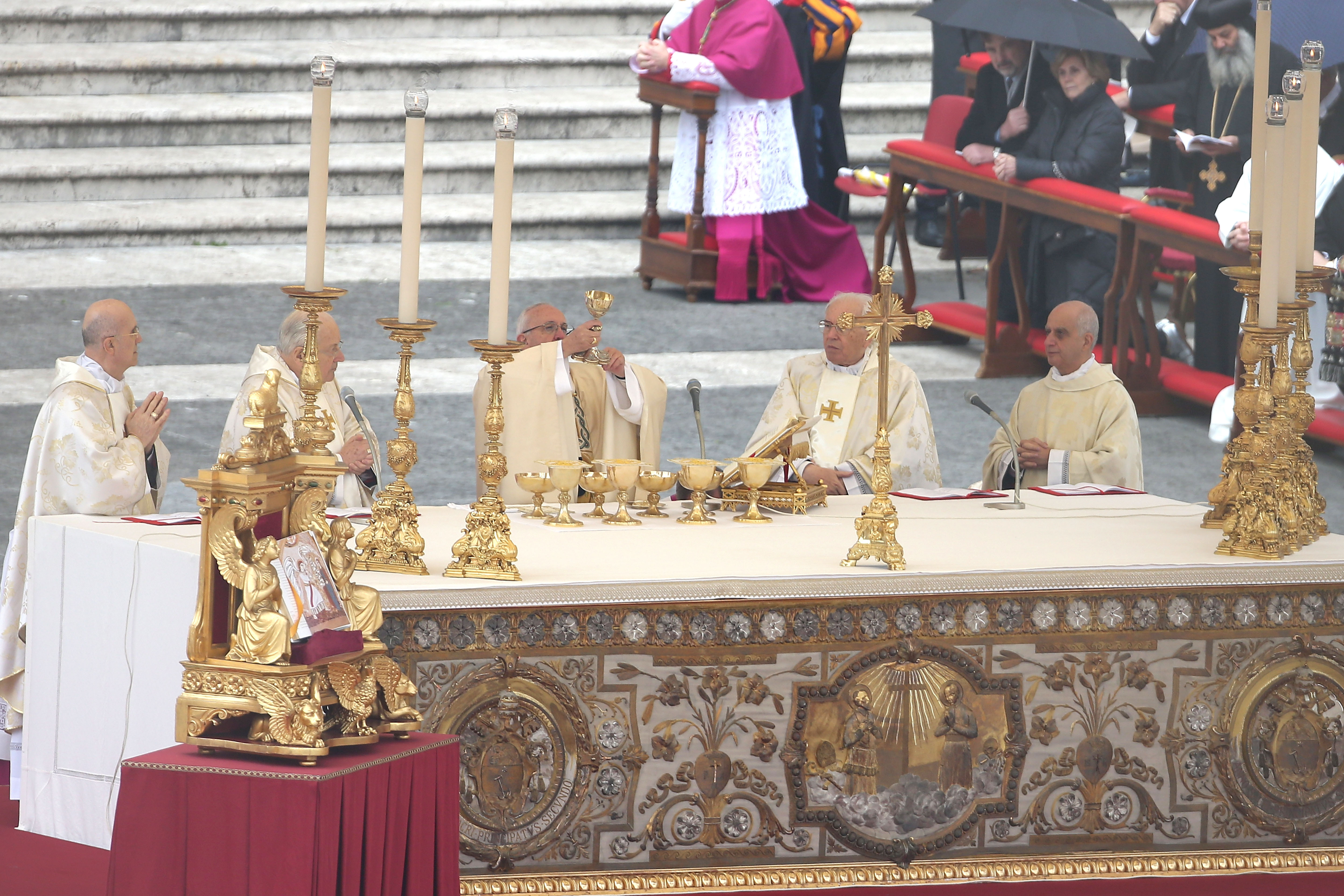 Pope Francis celebrates Mass and opens the Holy Door of St Peter’s Basilica on 8 December 2015 in Vatican City. During the Solemnity of the Immaculate Conception of the Blessed Virgin Mary, he inaugurated the Jubilee Year of Mercy. “The Extraordinary Holy Year is itself a gift of grace,” the pope said in his homily.