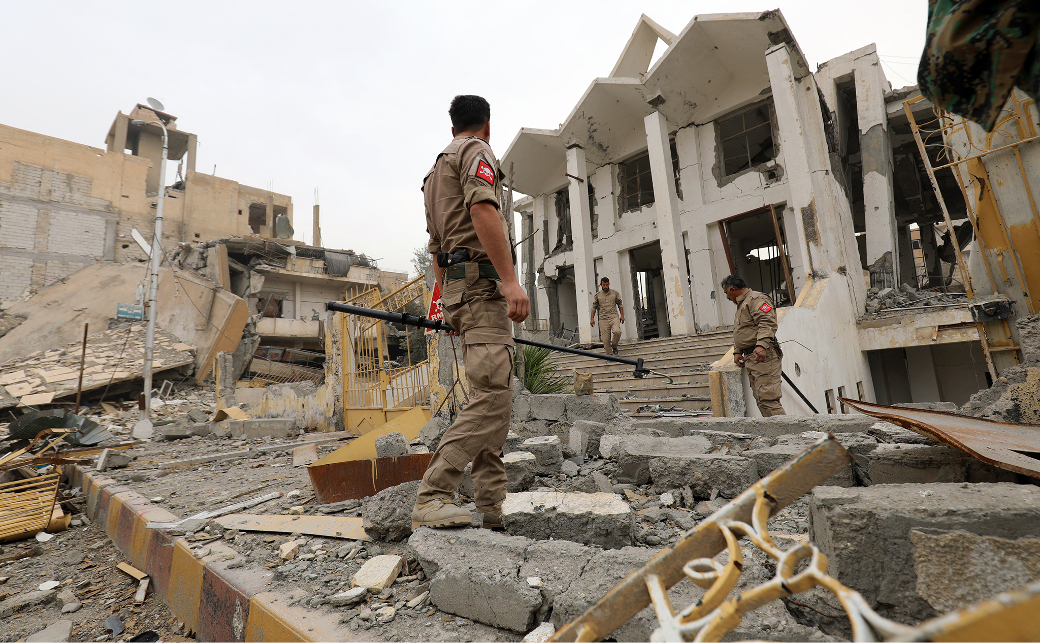 A member of a six-person team from the Roj Mine Control Organization, a non-governmental organisation working in Kurdish-held areas, stands with an explosives detector outside the heavily damaged Armenian Catholic Church of the Martyrs in the city centre of Raqqa, eastern Syria, on 20 December 2017.