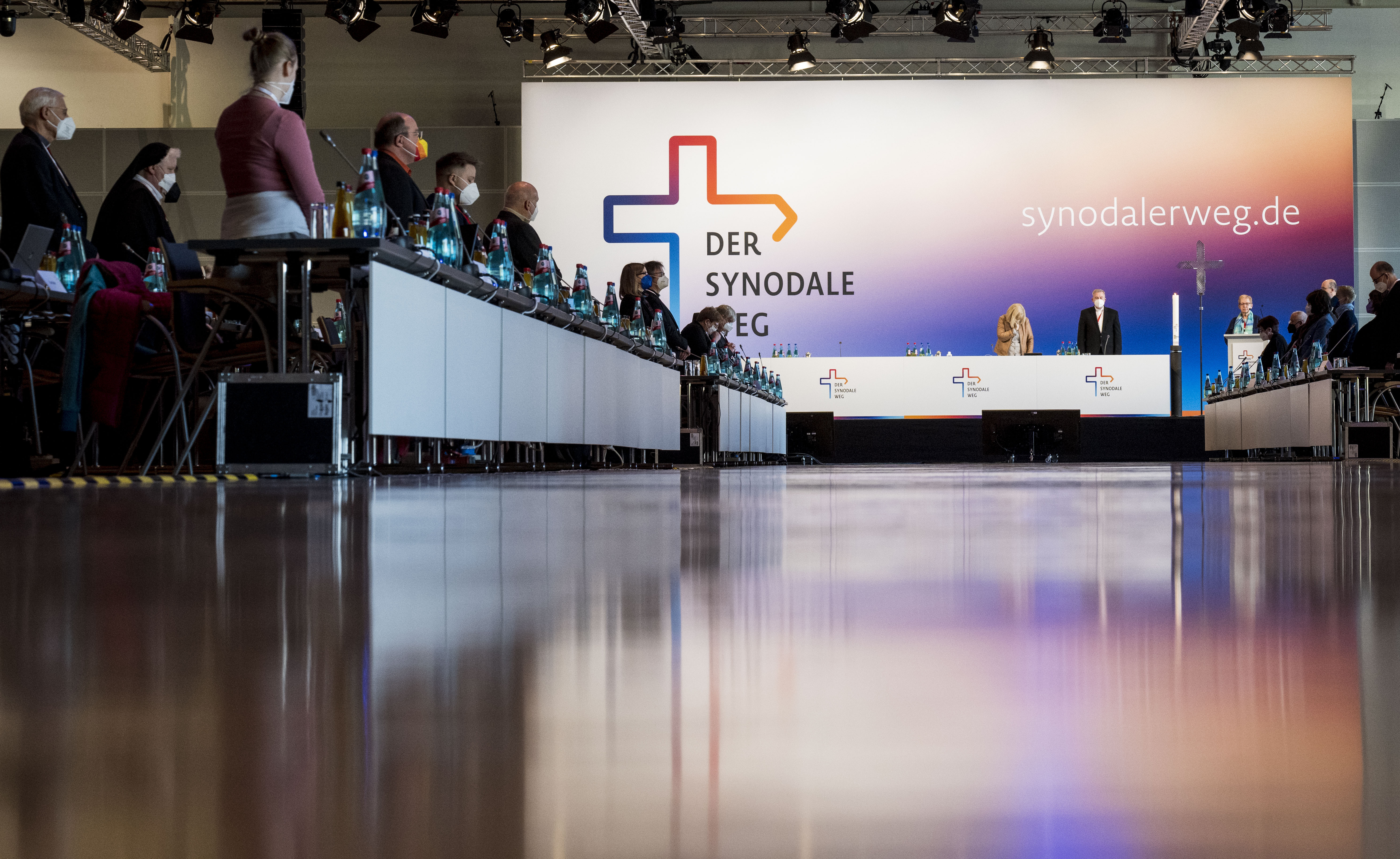 Synod members sing and pray during the final day of the “Synodaler Weg” Catholic reform movement congress on 5 February 2022 in Frankfurt, Germany. In 2022, the German Synodal Way advanced votes endorsing same-sex blessings, women’s preaching, changes to sexual ethics, and reconfiguration of Church authority.