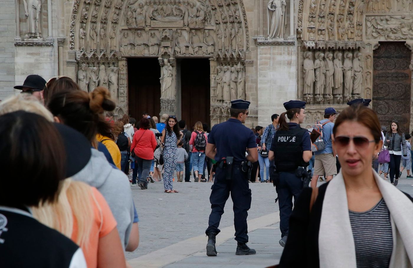 Two people were in custody Wednesday after a car parked near Notre Dame Cathedral in Paris was found with seven gas canisters inside, and its licence plates removed.