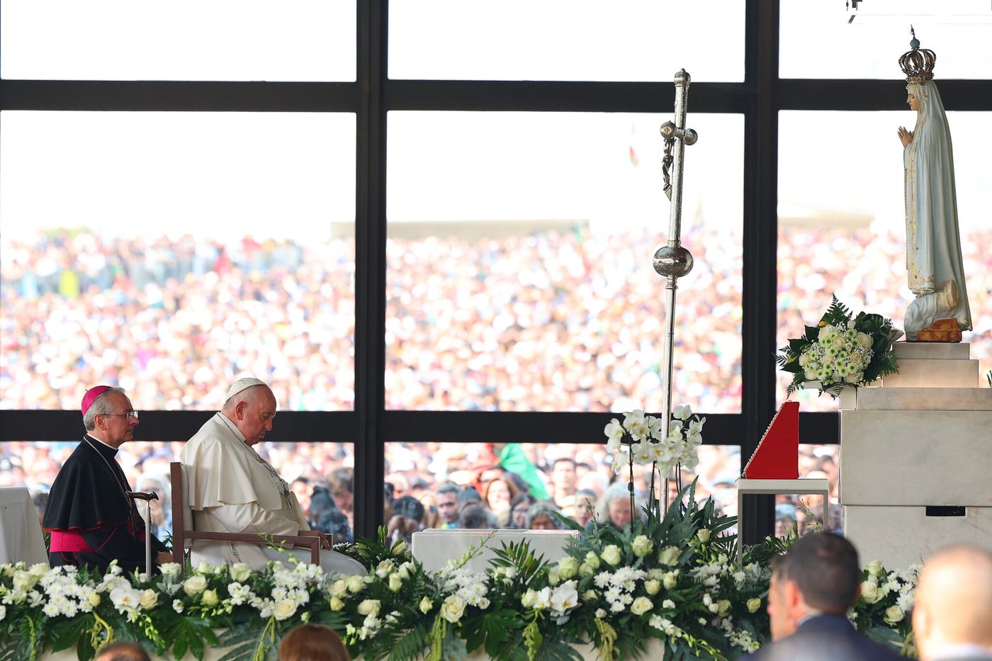 Pope Francis asked those present to look at the famous statue of Our Lady of Fátima in the shrine’s outdoor chapel, where the rosary was prayed, and to reflect silently in their hearts on what she is telling them, offering her their worries, concerns, motivations and interests.