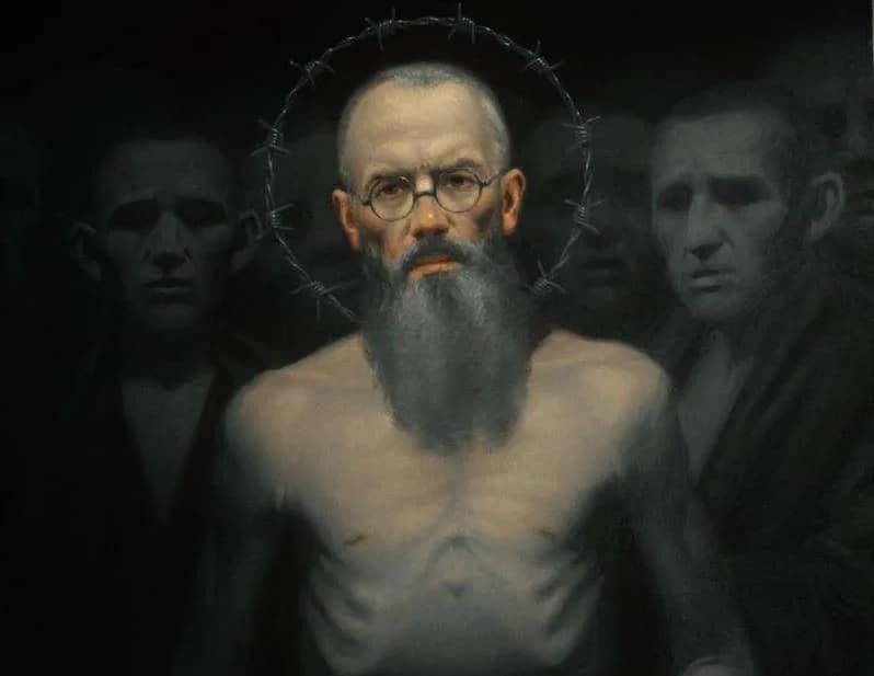 <em>Photo: 'Saint Maximilian Kolbe, Martyr of Charity', painted by Neilson Carlin, oil on canvas; the painting depicts Kolbe as a saint in Auschwitz with a barbed wire halo; screenshot from <a href="https://christian.art/daily-gospel-reading/matthew-18-15-20-2024/"><mark style="background-color:rgba(0, 0, 0, 0)" class="has-inline-color has-vivid-cyan-blue-color">www.christian.art</mark></a>.</em>