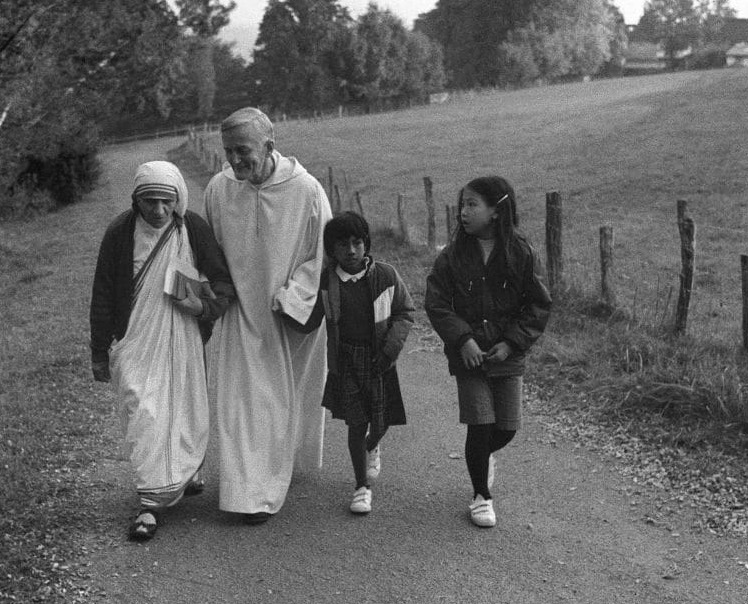 Photo: Mother Teresa of Calcutta (left), the humble nun known as the 'saint of the gutters', walks together with the brother Roger Schutz-Marsauche, founder and preacher of the community of Taize, during her pilgrimage to Taize, 23 October 1983. Mother Teresa was beatified 19 October 2003 by Pope John-Paul II. (Photo credit: LUC NOVOVITCH/AFP via Getty Images.)