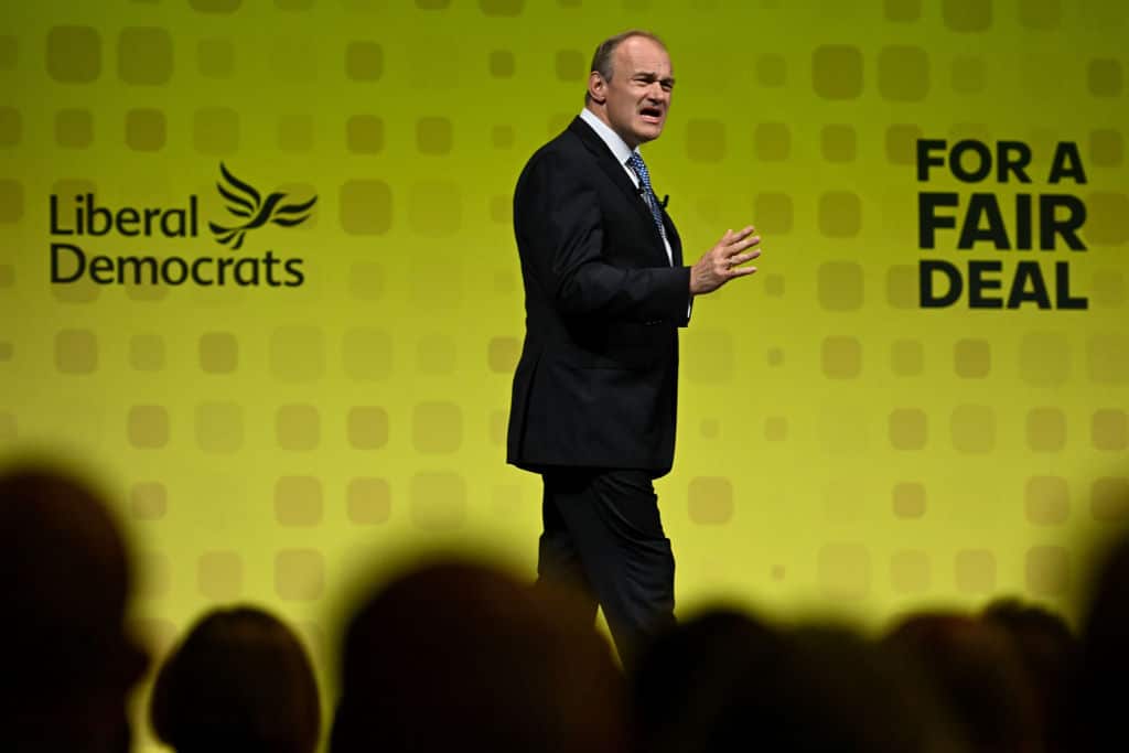 Photo: Sir Ed Davey, leader of the Liberal Democrats, delivers his keynote speech during the Liberal Democrat conference at Bournemouth International Centre in Bournemouth, England, 26 Septembe 2023. (Photo by Finnbarr Webster/Getty Images.)