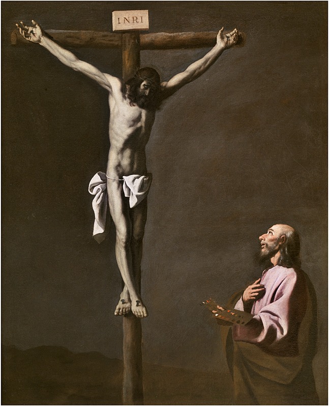 The exhibition closes with The Crucified Christ with a Painter, which shows just that: Christ on the Cross, affixed by four nails, his head hanging down, his skin grey in death. The Cross is starkly alone against a dark and cloudy sky, the time when the sun was darkened; the hills in the background are barely visible. But below the Cross, at a little distance, there stands a man in striking soft pink, looking up at Christ with the utmost tenderness and reverence, one hand on his chest, the other gesturing towards him. It is such a striking image, those two figures, that it is only on closer inspection that we find that the gesturing hand is holding a palette and paints, with the paint distributed as for painting. It could well be Zurbarán himself, and his attitude of reverence and awe may be telling us how he saw the work of sacred art, his art: to inspire devotion, to draw the viewer in contemplation towards the suffering Christ. The attitude of the painter, gazing up at the dead Christ, is that of the viewer looking at both. It is art in the service of affective piety.