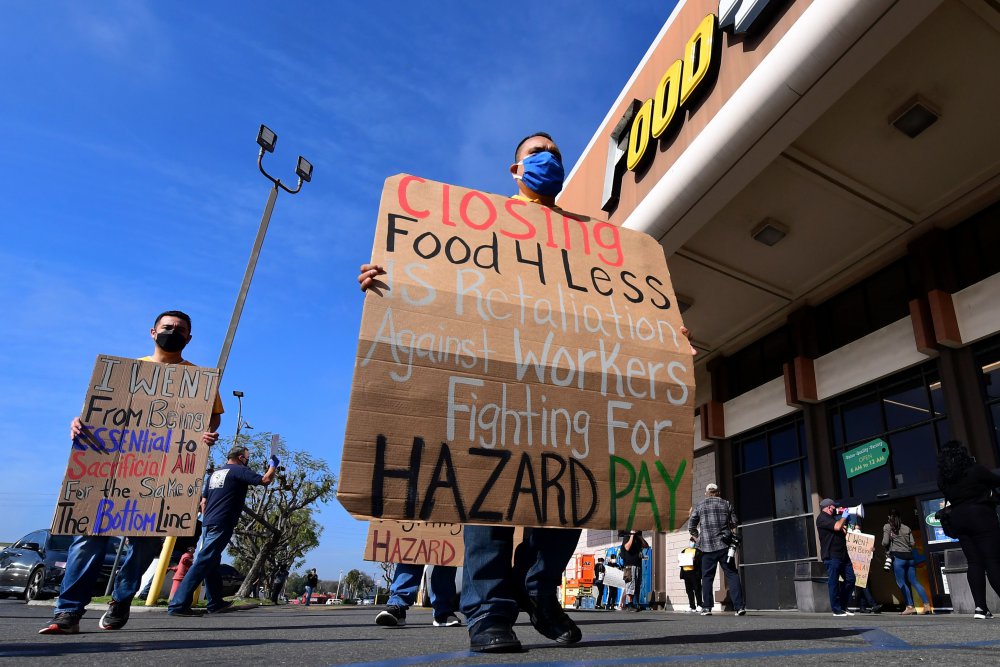 supermarket workers hold placards in protest in front of a food 4 less supermarket in long beach, california on february 3, 2021. (photo by ...
