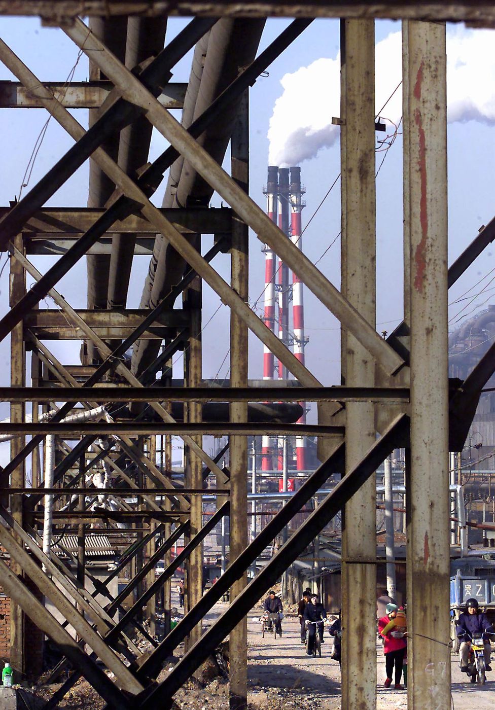 chinese workers walk down a dirt access road from one of beijing's major air polluters, the capital iron and steel factory, 16 february 2001...